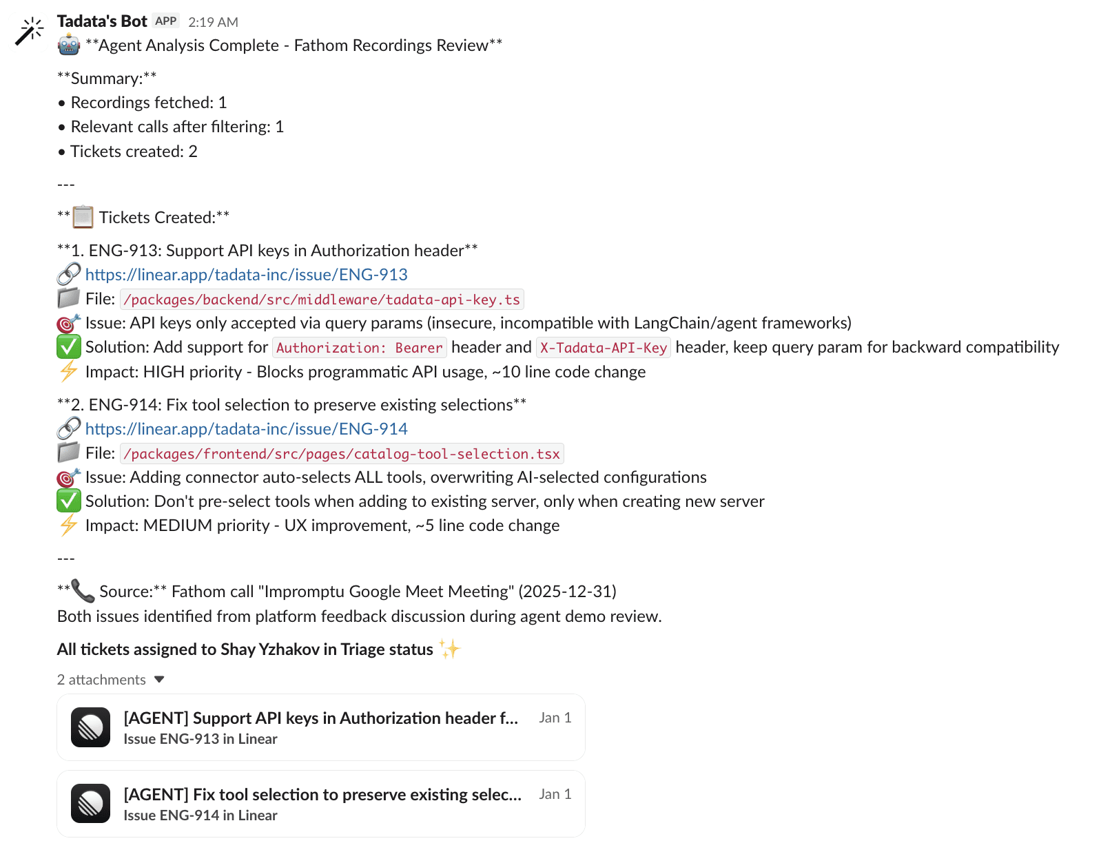 We created an agent that reviews customer call recordings and automatically creates Linear tickets with the implementations for the suggested new features.